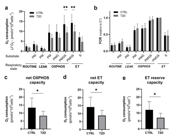 To analyze differences between the mean values of the various respiratory states of the two groups of subjects, two-way ANOVA of specific oxygen flow values (J°O2-pmol O2/s*106 cells−1) was performed (Figure 1c). Overall, we found a significant difference between groups (ANOVA p < 0.0001); furthermore, samples from the T2D group showed reduced maximal phosphorylative capacity (OXPHOSPMGS −30%; p = 0.006) and maximal non-coupled respiratory capacity (ETPMGS −30%; p = 0.004) (Figure 2a, Table 4). We also evaluated the relative contribution of mitochondrial complexes and substrate combinations using a qualitative analysis of data expressed as flux control ratios (FCR), in which data are expressed relatively to the maximal non-coupled oxidative capacity (ET). In this case, the means of two groups show no relevant difference (Figure 2b, Table 4). Net and reserve capacities resulted to be significantly reduced in mitochondria from the T2D compared to the CTRL group (net OXPHOS capacity −40%, p = 0.03; net ET capacity −38%, p = 0.03; and ET reserve capacity −41%, p = 0.02) (Figure 2c–e, Table 4).