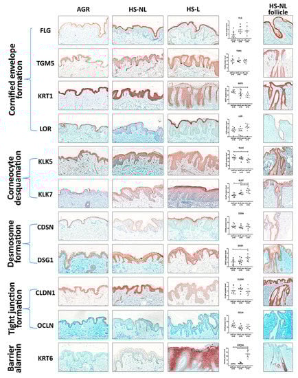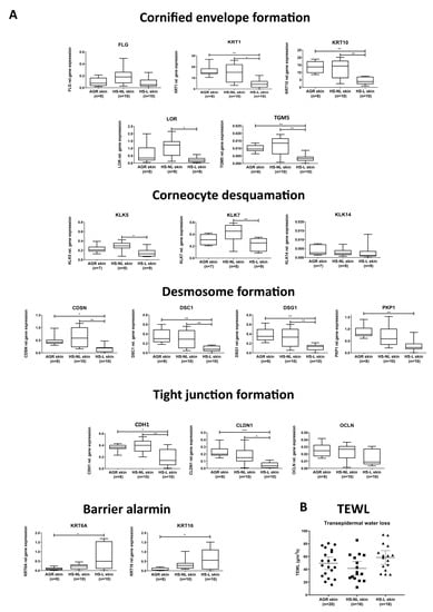 To investigate the permeability barrier in HS at the molecular level, SC components, including elements of CE formation (structure proteins, FLG, LOR, KRT1, KRT10, TGM5), corneocyte desquamation (KLK5, KLK7, KLK14), desmosome formation (DSG1, DSC1, PKP1, CDSN), together with TJ proteins (CDH1, CLDN1, OCLN), and barrier alarmins (KRT6A, KRT16) were investigated at the gene level with RT-qPCR in lesional and non-lesional HS skin and in healthy skin samples as control (AGR).