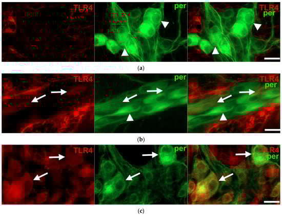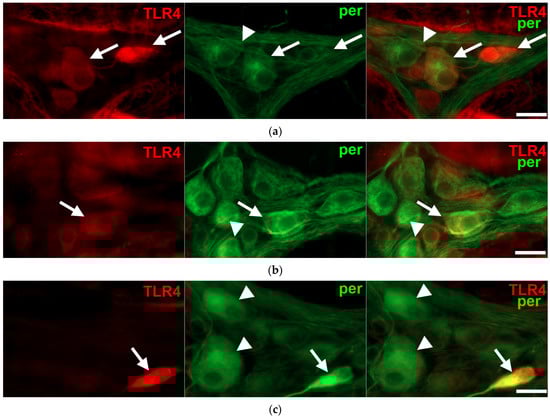 Representative fluorescent micrographs of whole-mount preparations of myenteric ganglia from the duodenum (a), ileum (b) and colon (c) of a control rat after TLR4-peripherin double-labelling immunohistochemistry. Peripherin was used as a pan-neuronal marker to label myenteric neurons. Arrows—TLR4-immunoreactive myenteric neurons, arrowheads—myenteric neuron, scale bars: 20 μm.