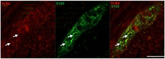 Representative fluorescent micrographs of a paraffin section from diabetic duodenum showing the myenteric plexus after TLR4-S100 double-labelling immunohistochemistry. S100 was applied to label enteric glial cells. Arrows—enteric glia cells, scale bars: 10 μm.