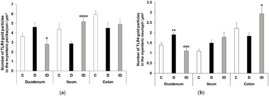 Quantitative evaluation of gold particles labelling TLR4 in perikaryon of myenteric neurons (a) and ganglionic neuropil (b) from different gut segments of control, diabetic and insulin-treated diabetic rats. TLR4 density increased both in myenteric perykaryon and the neuropil of the diabetic duodenum, decreased in both compartments in the diabetic colon and a subcellular rearrangement of myenteric TLR4-labelling gold particles was revealed in the ileum of diabetics. Statistics: Kruskal-Wallis test with Dunn’s multiple comparisons test. Data are expressed as means ± SEM. ** p < 0.01 (relative to controls); o p < 0.05, ooo p < 0.001, oooo p < 0.0001 (between diabetics and insulin-treated diabetics). C—controls, D—diabetics, ID—insulin-treated diabetics.