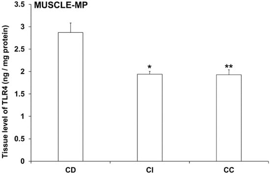 In controls, TLR4 tissue levels of MUSCLE-MP homogenates (including the myenteric plexus and intestinal smooth muscle layers) showed a distinct variation from duodenum to colon. TLR4 concentration was 2.87 ± 0.21 ng/mg in the duodenum, while it was significantly lower in the ileum and colon (1.94 ± 0.07 ng/mg, p < 0.05; and 1.93 ± 0.11 ng/mg, p < 0.01; respectively) (Figure 8).