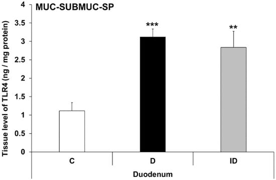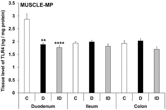 According to our results, TLR4 tissue levels of MUSCLE-MP homogenates decreased from duodenum to colon. While these homogenates consist of mainly smooth muscle cells, our data showed that the TLR4 expression was different along the gastrointestinal tract. The diabetic state only affected the duodenum, where the TLR4 tissue levels in the MUSCLE-MP decreased relative to control data. Therefore, the MUC-SUBMUC-SP homogenates were also observed, and our data showed a significant increase of TLR4 levels in the diabetic duodenum compared to controls. This difference in tissue TLR4 concentration among the layers of the intestinal wall may highlight the significance of TLR4 expression in the crosstalk of microbiota, the intestinal epithelium, and the immune, neural, and glial cells in health and disease. This is also proven by knockout studies in which attenuated inflammation was observed in TLR knockout mice [,].