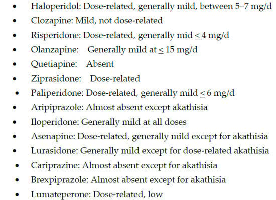 - Nasrallah, H.A.; Mulvihill, T. Iatrogenic disorders associated with conventional vs. atypical antipsychotics. Ann. Clin. Psychiatry 2001, 13, 215–227. [Google Scholar] [CrossRef]