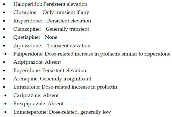 - Kelly, D.L.; Powell, M.M.; Wehring, H.J.; Sayer, M.A.; Kearns, A.M.; Hackman, A.L.; Buchanan, R.; Nichols, R.B.; McEvoy, J.P.; Adams, H.A.; et al. Adjunct Aripiprazole Reduces Prolactin and Prolactin-Related Adverse Effects in Premenopausal Women with Psychosis: Results from the DAAMSEL Clinical Trial. J. Clin. Psychopharmacol. 2018, 38, 317–326. [Google Scholar] [CrossRef]