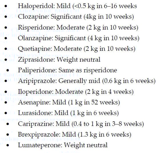 - Kroeze, W.K.; Hufeisen, S.J.; Popadak, B.A.; Renock, S.M.; Steinberg, S.; Ernsberger, P.; Jayathilake, K.; Meltzer, H.Y.; Roth, B.L. H1-histamine receptor affinity predicts short-term weight gain for typical and atypical antipsychotic drugs. Neuropsychopharmacology 2003, 28, 519–526. [Google Scholar] [CrossRef]
