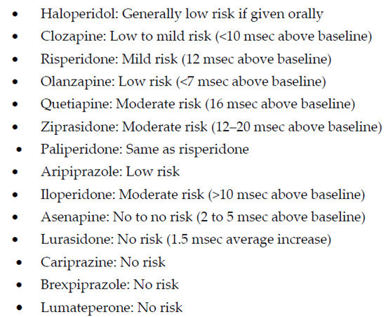 - Camm, A.J.; Karayal, O.N.; Meltzer, H.; Kolluri, S.; O’Gorman, C.; Miceli, J.; Tensfeldt, T.; Kane, J.M. Ziprasidone and the corrected QT interval: A comprehensive summary of clinical data. CNS Drugs 2012, 26, 351–365. [Google Scholar] [CrossRef]