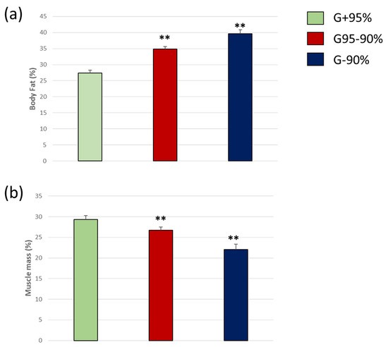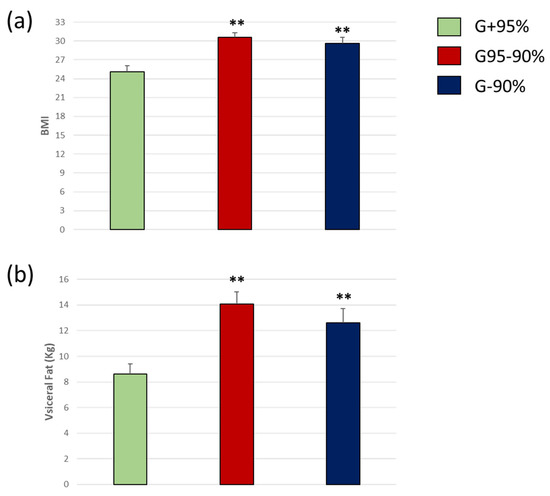 | G95 − 90% | 166.53 ± 8.21 cm | 84.35 ** ± 12.56 Kg | 30.61 ** ± 0.72 | 1570.53 ± 223.23 Kcal/day |