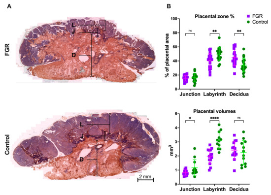 Placental histology: (A) placentas with cytokeratin/lectin double staining; (B) placental zone proportions from 19 FGR and 20 control placentas from 13 litters. Data were analyzed using a linear mixed-effects model and displayed as median ± IQR with significance as ns p > 0.05; * 0.05 ≥ p > 0.01; ** 0.01 ≥ p > 0.001.; **** p < 0.0001. D: decidua; FGR: fetal growth restriction; J: junction zone; L: labyrinth zone.