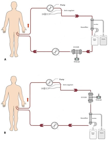 Respiratory failure is defined as a failure of the lung to oxygenate the arterial blood adequately and/or to prevent carbon dioxide (CO2) retention [1]. Different types of respiratory failure are associated with various degrees of hypoxemia and CO2 retention; hypercapnia usually is associated with hypoventilation and ventilation–perfusion inequality. Most patients with respiratory failure require mechanical ventilation (MV), and in some cases, extracorporeal respiratory support as well [2]. These therapies encompass extracorporeal membrane oxygenation (ECMO) and the extracorporeal CO2 removal system (ECCO2R). ECMO takes over the gas exchange function of the lungs, ensuring full oxygenation and CO2 removal. ECCO2R is a CO2 removal system that does not affect oxygenation, whose principal aim is enabling lung-protective MV (LPV) by limiting the risks of ventilator-induced lung injuries (VILIs) [3]. In this review, we discuss the principles of ECCO2R and its main clinical applications, focusing on experiences of the use of ECCO2R in combination with continuous renal replacement therapy (CRRT) in patients with or without renal failure.