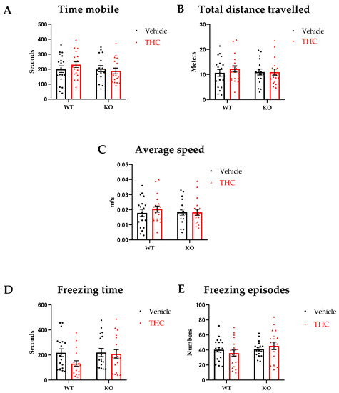 Open field, general locomotion. WT-vehicle n = 19, WT-THC n = 18, KO-vehicle n = 19, KO-THC n = 18; Male and female mice were included. (A) Time mobile. (B) Total distance travelled. (C) Average speed. (D) Freezing time. (E) Number of freezing episodes. Data are expressed as mean ± SEM Two-way ANOVA plus post hoc comparison test.