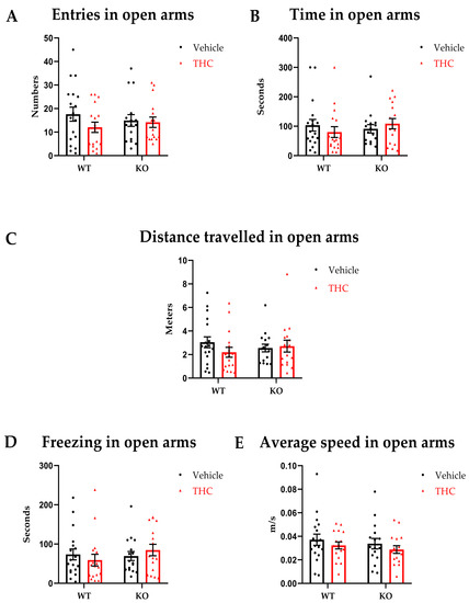 Elevated Zero Maze. WT-vehicle n = 19, WT-THC n = 18, KO-vehicle n = 19, KO-THC n = 18. Male and female mice were included. (A) Entries in open arms. (B) Time spent in open arms. (C) Distance travelled in open arms. (D) Average speed in open arms. (E) Time spent freezing in open arms. Data are expressed as mean ± SEM. Two-way ANOVA plus post hoc comparison test.