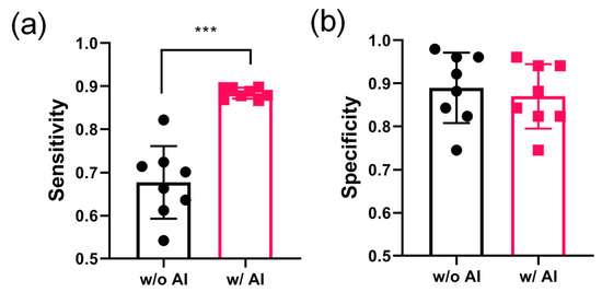 Since AI assistance tremendously ameliorates the sensitivity of detecting small nodules in CT images and provides a reference for doctors’ interpretation, the AI detection accuracy, such as false positive and false negative ratios, was addressed. The four junior doctors’ examination results were compared with the ground truth data collected from the medical centers and statistically analyzed according to the equation shown in the Materials and Methods section. Sensitivity reveals the ratio of doctors misjudging the “false negative,” reflecting whether the doctor underestimates the “true positive” nodule on the CT images. All eight junior doctors from both medical centers had a higher nodule-detecting sensitivity with the assistance of the AI algorithm. The average sensitivity significantly increased from 67.7% without AI assistance to 88.4% with AI assistance (p < 0.001) (Figure 4a). Specificity reveals the ratio of doctors misjudging the “false positive,” reflecting the accuracy of predicting the “true negative” on the CT images. The data revealed that the specificity was slightly lower for detection with AI assistance than that without it; however, no statistically significant difference (p > 0.05) was observed. The average specificity decreased from 89% without AI assistance to 87% with AI assistance. Our data demonstrated that AI assistance significantly augmented the sensitivity of nodule detection without sacrificing specificity, thereby maintaining a high recognition ratio for “true negatives”.
