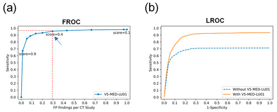 Data were collected from both medical centers for analysis of the FROC and LROC plots, revealing the FROC curve when the AI score was ≥0.4, the FP rate per CT study was 0.3, and the sensitivity reached 95.6% (Figure 6a). The LROC trapezoid area in AI-assisted CT screening was significantly superior to that of the area without AI assistance (Figure 6b). Therefore, based on the FROC curve, the AI score was set as 0.4 for doctors’ examinations with AI assistance throughout this study.