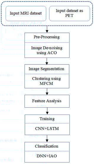 The hybrid system’s primary objective is to detect AD early. Brain atrophy is a crucial factor in the diagnosis of AD. The MRI dataset values are preprocessing and noise removal using the ACO algorithm. The MFCM image segmentation technique identifies brain atrophy, and the atrophy of the cerebral cavity was verified using image gradients. A gradient in a photograph refers to a variation in the image’s color or intensity. The combination of the CNN+LSTM algorithm has been used to train the dataset for up to 20 epochs. The optimization and classification procedure has been done by the IAO method. The previous method employs a straightforward procedure and a modest level of visual complexity. The proposed technology eliminates early detection without causing brain damage and completes 98.5% of the indicated procedures. Deep Learning methods classify the patient as stable, first-stage AD, second-stage AD, or moderate cognitive dysfunction. The proposed system contributes to the medical imaging field, and it showed higher accuracy performance when compared to other existing ones. The early detection and classification of AD are more accurate in the proposed system, as shown in Figure 2.