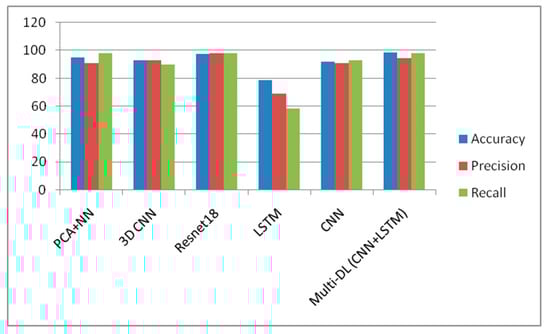 The proposed model has been compared with various methods like PCA, CNN, Resnet18, and DCNN. Table 2 illustrates the accuracy, precision, and recall values and the comparison chart in Figure 11.