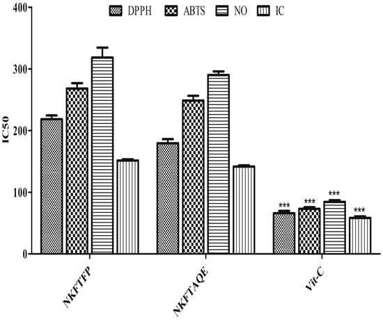 Free-radical scavenging capacity of NKFTFP and NKFTAQE. The statistical representation was made as mean ± SD (n = 3). The comparisons are with respect to IC50 for each sample. The statistical significance level is expressed at *** p < 0.001. The data represented by ‘***’ in Vit-C group showed significant variation in the activity then others.