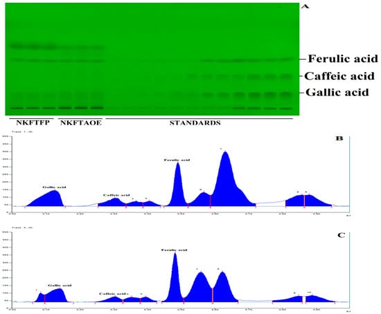 HPTLC quantitative estimation for the simultaneous separation of gallic acid, caffeic acid and ferulic acid in NKFTFP and NKFTAQE was performed, successively. The resulting data reveal numerous numbers of major metabolites in both samples, while validation analysis for simultaneous separation of gallic acid, caffeic acid and ferulic acid was found linear, accurate and robust in the wide range of 150–2400 ng/spot. The limit of detection (LOD) and the limit of quantitation (LOQ) were found as 30.022, 26.454 and 18.22 ng/spot and 90.978, 80.164 and 55.220 ng/spot, respectively. The interday and intraday precision were determined as percentage relative standard deviation or the coefficient of variation, and the results found were expressed in the ranges 1.519–4.772, 1.155–4.237, 1.094–3.075 and 1.536–4.938, 1.165–4.114, 1.103–3.012, respectively. The accuracy of the method developed was determined as the percentage drug recovered by spiking 0, 50, 100 and 150% of the standard to the sample in pre-analyzed samples, which exhibited recovery in the ranges 95.78–103.55%, 97.8–100.62% and 100.72–101.49% for gallic acid, caffeic acid and ferulic acid. Afterward, the drug content in NKFTFP and NKFTAQE was calculated and found to be 0.102 ± 0.038%, 0.064 ± 0.003% for gallic acid; 0.121 ± 0.004%, 0.115 ± 0.005% for caffeic acid; and 0.912 ± 0.033%, 0.956 ± 0.0396% for ferulic acid, respectively. HPTLC plate view at 254 nm and chromatograms of NKFTFP and NKFTAQE are summarized in Figure 2.