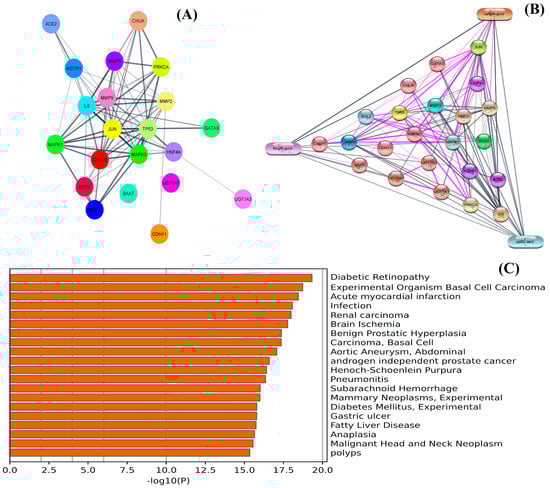 Network pharmacology analysis: (A) represents PPI network and (B) represents CPI network of integrated genes, while (C) represents GO analysis of screened genomes in the pathophysiology of kidney disease and associated disorders.