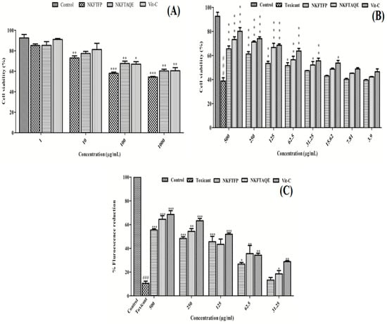 Using DCFH-DA as a fluorescent probe indicator, CAA was determined to assess the intracellular ROS protection of NKFTFP and NKFTAQE against induced oxidative stress by cisplatin on HEK 293 cells. In contrast, the results reveal that NKFTFP, NKFTAQE and Vit-C have significant (p < 0.05) efficacy to quench intracellular ROS production induced by cisplatin. However, NKFTAQE showed higher efficacy than NKFTFP but relatively have no significant difference in their bioactivity. NKFTFP, NKFTAQE and Vit-C at higher concentrations (500 µg/mL) have maximum fluorescent reduction as 50.39 ± 1.34%, 58.62 ± 3.85%, 62.28 ± 4.15%, respectively. Further, the statistical representation was made with respect to their corresponding concentration and the statistical data were found statistically significant (p < 0.05). The graphical representation of CAA is shown in Figure 4C.