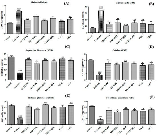 Effect of NKFTFP and NKFTAQE on MOA (A), NO (B), SOD (C), CAT (D), GSH (E) and GPx (F), which were observed against cisplatin-induced oxidative stress in the kidney. The resulting data are expressed statistically as mean ± SD (n = 6) using one-way ANOVA followed by the Tukey test to compare all pairs of the column. The comparisons are for control to toxic (###) and toxic to drug-treated group (*/**/***). The statistical significance level is expressed at * p < 0.05 (less significant), ** p < 0.01 (significant) and ###/*** p < 0.001 (high significant). The data represented by ‘*/**/***’ showed statistical difference in the activity as compared to the toxicant group.