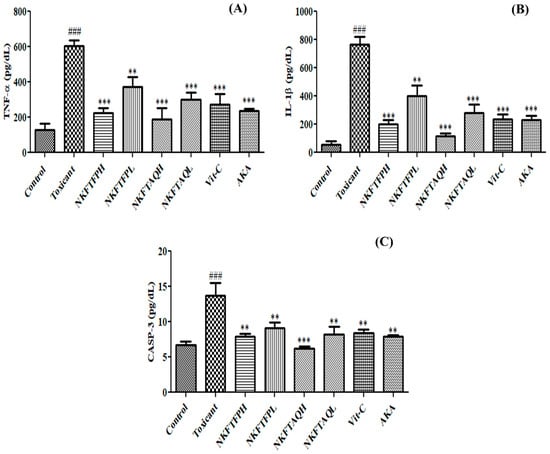 Effect of NKFTFP and NKFTAQE against inflammatory cytokines TNF-α (A), IL-1β (B) and CASP-3 (C) induced by cisplatin in kidney tissues. The resulting data are expressed statistically as mean ± SD (n = 6) using one-way ANOVA followed by the Tukey test to compare all pairs of the column. The comparisons are made between control to toxic (###) and toxic to drug-treated group (**/***). The statistical significance level is expressed at ** p < 0.01 (significant) and ###/*** p < 0.001 (high significant). The data represented by ‘**/***’ showed statistical difference in the activity as compared to the toxicant group.