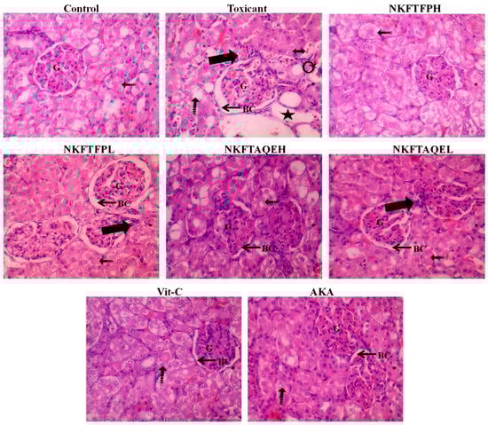 The effect of cisplatin-induced nephrotoxicity and its amelioration by NKFTFP and NKFTAQE was assessed by histopathological section evaluation of the kidney. The observations reveal a significant protective effect from NKFTFP and NKFTAQE against distorted renal architecture induced after treatment with cisplatin. However, it can be demonstrated that two days of treatment with cisplatin drastically depletes the shape of Bowman’s capsule, proximal tubule, distal tubule, destructured brush border cells and epithelial cells, as observed through histopathological examination. Similar to that of the normal control group, NKFTFP, NKFTAQE and Vit-C restore the distorted architecture of the kidney and ameliorates the normal function of kidney. The histopathological section analysis of the kidney is summarized in Figure 7.