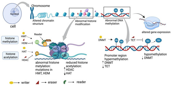 Epigenetic regulation in cancer. DNA within the nucleus of a cell is found to be densely wrapped in the chromatin structure with nucleosome as the basic unit. Alteration in the chromatin structure leads to aberrant gene expression, which is mainly regulated by an epigenetic mechanism. This includes DNA methylation, and histone modification carried out by epigenetic regulators such as writers, erasers, and readers. Histone modification (histone acetylation and histone methylation) maintains chromatin accessibility and gene expression by modulating N and C terminal histone tail. Acetylation of histone, carried by histone acetyltransferase (HAT), is responsible for gene expression, whereas histone deacetylation by histone deacetyl transferase (HDAC) is responsible for gene repression. Similarly, histone methylation, carried by histone methyltransferase (HMT), transfers a methyl group to histone tails from donor S-adenyl methionine (HDM) responsible for gene expression, whereas demethylation by eraser histone demethylase (HDM) resulted in gene repression. DNA methylation by DNA methyltransferase (DNMT) at CpG island, near the promoter region, inhibits gene expression by affecting transcription factor binding to DNA, whereas hypomethylation at the promoter region promotes gene expression. Abnormal DNA methylation and histone modification are observed in cancer generally due to mutation in these epigenetic markers, hence being one of the causes responsible for aberrant gene expression in cancer.
