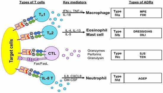 The delayed-type hypersensitivity reaction is also called a type IV reaction, classified by Gell and Coombs, and mainly involves T cell-antigen recognition, accompanied by the activation of other leukocytes [17]. According to the types of mostly involved T cells and their downstream mediators, the type IV reaction is sub-grouped as IVa, IVb, IVc, and IVd [18] (Figure 1). Type IVa, IVb, and IVd are mediated by TH1, TH2, and IL-8-producing TH cells, respectively, and involve other inflammatory cells, such as macrophages, eosinophils, and neutrophils. The type IVa reaction mainly involves TH1 cell activation, which releases chemokines and cytokines, such as IFN-γ and TNF-β, to recruit and activate macrophages to produce inflammatory mediators, such as TNF-α [19]. Type IVa drug hypersensitivity is suggested to be associated with MPE and FDE. The type IVb reaction mainly involves TH2 cell activation, which releases IL4, IL13, IL-5, and eotaxin to activate eosinophils and mast cells. Type IVb drug hypersensitivity is suggested to mediate the pathogenesis of DRESS/DiHS and DILI [20,21,22,23]. The CXCL8/IL-8-producing Th cells mediate the type IVd reaction via producing CXCL8 and GM-CSF to activate neutrophils, which are predominately in drug-related AGEP. By comparison, type IVc drug hypersensitivity mainly involves cytotoxic T cells; here, cytotoxic T lymphocytes (CTL) directly kill target cells by releasing cytotoxic cytokines, including granulysin, granzymes, and perforin, and also by cellular contact through a Fas/FasL pathway [24]. Type IVc drug hypersensitivity is mainly involved in SJS/TEN (Figure 1).