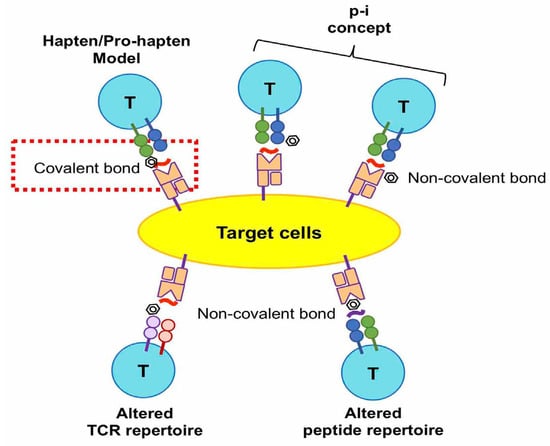 - The altered TCR repertoire model proposes that culprit drugs directly interact with TCR, and not with the peptides nor the HLA molecules. The antigenic molecules bind to specific TCRs and cause conformational change. The antigen-bound TCRs can interact with HLA-endogenous peptide complexes and elicit immune reactions [35]. In this model, the TCR repertoire is altered upon interaction with the drug/metabolite antigen. The drug antigen-bound TCR is essential in this model to induce drug hypersensitivity reactions [35].