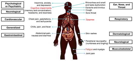 Symptoms of long-COVID-19. Multiple organ systems are affected, such as psychological or psychiatric (insomnia, anxiety, and depression), neurological (cognitive impairments involving memory and concentration, headache, dizziness, and peripheral neuropathy), ear, nose, and throat (rhinorrhea, smell and taste alterations, earache, tinnitus, cough, and sore throat), respiratory (dyspnea and cough), cardiovascular (chest pain, palpitations, and tachycardia), gastrointestinal (abdominal pain, nausea and diarrhea), generalized (chills, pain, and fever) and musculoskeletal (fatigue, myalgia, and joint pain). Dyspnea, fatigue, and cognitive impairments are among the most common symptoms. Reproduced from [] under Creative Commons.
