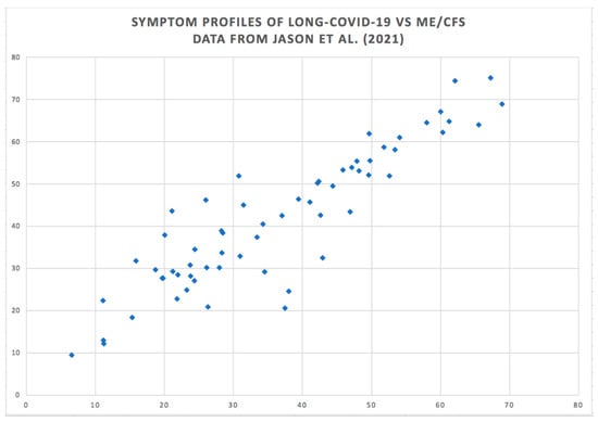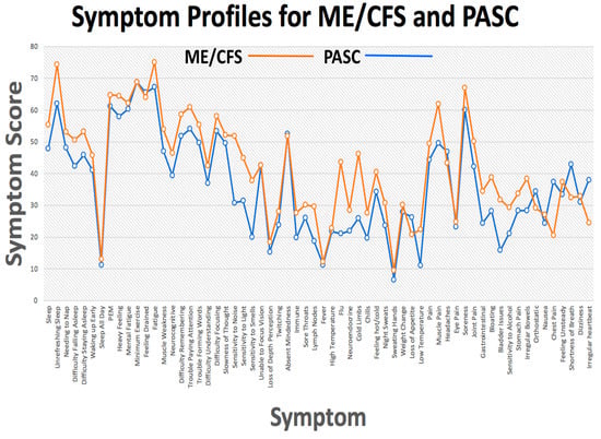 (1) The pattern of symptoms for ME/CFS and PASC is highly similar. Using a psychometrically reliable and validated measure [], the correlation in mean symptom scores across 62 symptoms is 0.902.