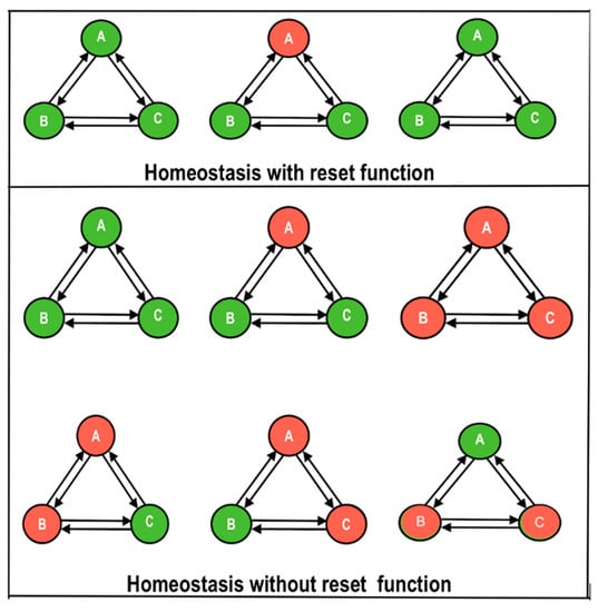 The dyshomeostasis hypothesis showing three processes or systems, A, B, and C. Upper panel: functioning normally, homeostasis resets any process that strays into disequilibrium. Upper left: A, B, and C are shown in equilibrium (green color). Upper center: A has fallen out of equilibrium (red) and requires a reset. Upper right: A is reset, and all three processes have returned to equilibrium. Lower panel: a non-resetting state of chronic dyshomeostasis is shown. Centre left: three systems A, B, and C in equilibrium (all green). Centre: A is out of equilibrium and requires a reset. Right: the system fails to reset and remains in disequilibrium. Lower left: A and B both are out of equilibrium. Lower center: A and C are out of equilibrium. Lower right: B and C are out of equilibrium. The system as a whole remains in unstable disequilibrium.