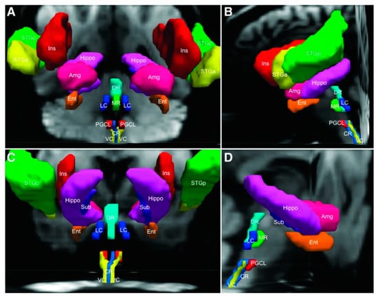 Brainstem seed regions and homeostatic forebrain regions are demonstrated with three-dimensional reconstructions in native diffusion space from an anterior (A), left lateral (B), posterior (C), and right lateral (D) perspective. Amg, amygdala; CR, caudal raphe; DR, dorsal raphe; Ent, entorhinal cortex; Hippo, hippocampus; Ins, insula; LC, locus coeruleus; MR, median raphe; PGCL, paragigantocellularis lateralis; STGa, superior temporal gyrus (anterior); STGp, superior temporal gyrus (posterior); Sub, subiculum; VC, vagal complex. Reproduced with permission from [].