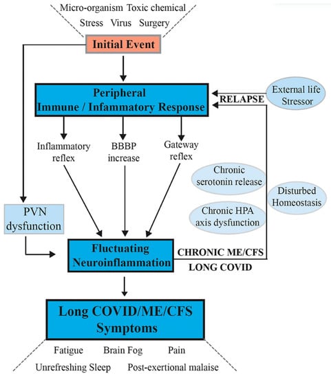 Figure 6. Hypothesis and model for onset of ME/CFS and its progression to a chronic sustained illness with relapse/partial recovery phases. Signaling pathways between the CNS and the periphery that maintain the illness. Following an initial external stressor event, systemic immune/inflammatory responses are activated. These are communicated to the CNS via inflammatory and gateway reflexes and possibly an increase in permeability of the BBB. Neuroinflammation is activated affecting the stress center within the PVN of the hypothalamus and leads to a wide range of neurological symptoms that feedback to the periphery via disturbance of homeostasis, and the stress-activated HPA axis that becomes dysfunctional with chronic activation. The systemic physiology and molecular homeostasis are then chronically affected through important cellular functions, such as mitochondrial energy production, metabolic activity, and a continuation of immune/inflammatory reactions. External life stressors that feed into a disturbed PVN not only maintain the ME/CFS but also act to precipitate relapses. Reproduced from [] with permission.
