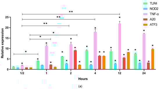 Relative expression of genes TLR4, NOD2, TNF-α, A20, and ATF3 with normalization for expression of GAPDH before in vitro stimulation in mononuclear cells of healthy donors after 30 min, 1, 2, 4, 12, and 24 h: (a) LPS; (b) GMDP; relative expression differences of more than 2 times were considered significant; data are represented as an average of three independent samples and error bars represent standard deviation; * p < 0.01; ** p < 0.001.