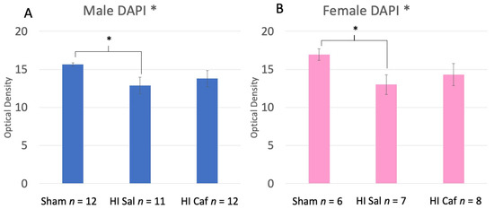 These two graphs display the DAPI results of the male (A) and female (B) animals. Sham refers to the animals that did not receive the HI procedure, HI Sal refers to animals that received the HI procedure but only received a saline treatment, and HI Caf refers to animals that received the HI procedure and were treated with caffeine. DAPI stain was used to measure chromatin condensation through optical density. The lower the optical density, the greater chromatin condensation and thus cell death (lower optical density indicates higher cell death). There was no Sex difference seen between Groups (p = 0.456 but displayed separately to illustrate comparable protection). There was an overall Group difference (p = 0.012), and based on a Tukey post-hoc analysis, a difference between HI saline and Sham animals (p = 0.012) was seen. Though there is no significant difference between HI saline and HI caffeine animals, the lack of difference between HI caffeine and Sham animals supports a partial reduction in cell death in caffeine-treated animals at 48 h post injury. * indicates a p-value less than 0.05.