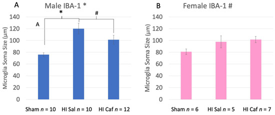 This figure displays male (A) and female (B) IBA-1 microglia soma size measurements side by side. Sham refers to the animals that did not receive the HI procedure, HI Sal refers to animals that received the HI procedure but only received a saline treatment, and HI Caf refers to animals that received the HI procedure and were treated with caffeine. For male animals there was an overall Group difference (p = 0.001). HI saline animals had a significant increase in microglia soma area, indicating more activation than Sham animals (p = 0.01). There was also a marginal one-tailed difference between HI saline and HI caffeine male animals (p = 0.08), indicating a reduction in activation after caffeine treatment. For female animals there was a marginal overall effect (p = 0.09), but no difference between HI saline and Sham animals nor HI saline and HI Caffeine animals. This indicates that caffeine failed to reduce activation in caffeine-treated HI females. * indicates a p value less than 0.05, # indicates a p value less than 0.1 but greater than 0.05.