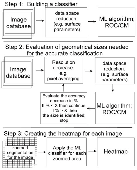 Figure 2c shows the results of Step 2 and the behavior of the classification accuracy for different sizes of the kernel used for blurring the images. Simple averaging is used here. For example, a size of 4 for the kernel means that each pixel of the original image is substituted with the value averaged over an area of 4 × 4 pixels. One can see that the accuracy starts to drop at a threshold of X = 80% if the size of the averaging size becomes greater than 32 × 32 pixels. Therefore, Step 3 will be executed using the zoom size of 32 × 32 pixels. It should be noted that the accuracy decreases rapidly, even with small averaging. We cannot, however, use those small numbers of pixels because we need a sufficient number of pixels to calculate the surface parameters. Therefore, we will keep the zoom size at 32 in this work.