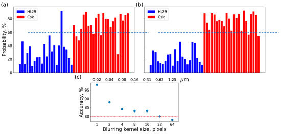 Figure 2c. One can see that the geometrical features of the order of 20–40 nm are rather important for the classification. When these features are averaged out, the accuracy drops substantially. The original images of cells were recorded with 512 × 512 pixels for an area of 10 × 10 µm