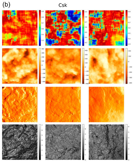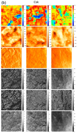 23]. Examples of these parameters are as follows: roughness average, root mean square (RMS), surface skewness, surface kurtosis, etc. Definitions and abbreviations for these parameters are standard. Commercial software (SPIP by Image Metrology A/S, Denmark) was used to calculate all those parameters. This conversion substantially decreases the dimension of the data space. Instead of 512 × 512 pixels per image, each image is now characterized with ~40 surface parameters.