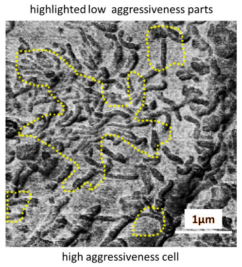 Figure 6 shows an example of a highly aggressive cell surface (the RM-restored adhesion is shown) with highlighted regions that were identified by the ML algorithm as the parts of low aggressiveness. The microvilli are clearly seen on the cell surface. One can speculate that the largest region of low aggressiveness is associated with a higher density of microvilli. Presumably, such a “one-dimensional” attempt to identify areas specific to high and low aggressiveness is not accurate. While it is an interesting way of thinking about high versus low aggressiveness, the microvilli density is definitely not the only indicator needed for precise identification. Even in the same image, one can see the (smaller) regions that do not show high microvilli density.