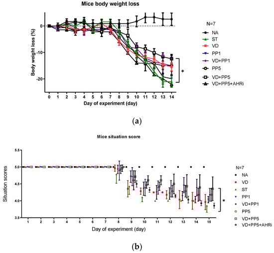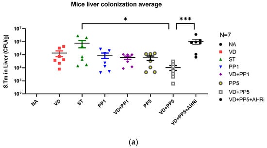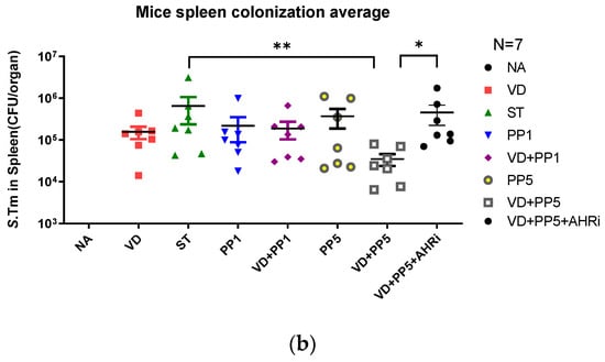 Our recent study [] observed the combined effects of butyrate and active 1,25-dihydroxyvitamin D3 (VD3) on antimicrobial peptides (AMPs) and anti-inflammatory responses in Salmonella colitis []. However, the generalization of the combined benefits of postbiotics and VD3 on Salmonella colitis and invasiveness, and the role of AhR on the benefits are not yet reported. Therefore, we investigate the role of AhR on the synergistic effects of postbiotics and VD3 on the severity of Salmonella colitis and invasiveness in mice.