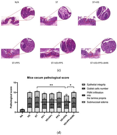 We recently observed [] the synergistic effects of postbiotic butyrate and VD3 on AMPs and anti-inflammatory responses in Salmonella colitis []. Propionic acid has a greater distribution in the small intestine than butyric acid. So, it is of interest to investigate the same benefits of PP in the therapy of Salmonella colitis. Accordingly, we demonstrated the same benefit of PP on the VD3-mediated reduced severity of Salmonella colitis as butyrate did. To confirm and generalize the involvement of AhR in the synergistic effects of PP on the VD3-mediated reduced severity of Salmonella colitis, we investigated the cecal pathology of Salmonella-infected WT mice after treatment of VD3 and/or PP along with intraperitoneal injection of AhR inhibitor. Consistent with our previous study [] in the histopathological analysis of H&E-stained cecal sections, we observed obvious pathological colitis in the Salmonella-infected WT mice group in Figure 1. In contrast, we observed that combining high-dose PP and VD3 significantly reduced the severity of Salmonella colitis in C57BL/6 mice, including the situation of diarrhea, loss of body weight, and pathologic scores; although low-dose PP had a beneficial effect, it was not significant. Furthermore, inhibition of AhR counteracted the synergistic benefit of combined treatment. It suggests that AhR is involved in the synergistic effects of PP on the VD3-mediated reduced severity of Salmonella colitis.