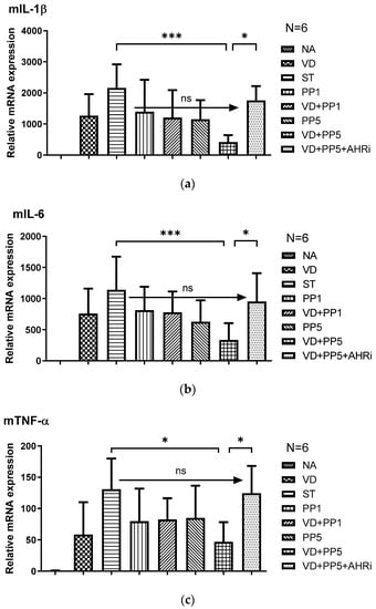 Based on our last study [] that demonstrated the combined effects of postbiotics on VD3-orchestrated anti-inflammatory and anti-bacterial responses in Salmonella colitis and the above finding, we proceeded to investigate the involvement of AhR in the combined effects of both supplements on the pro-inflammatory cytokines and AMP expression in Salmonella colitis. The gene expression of mIL-1β, mTNF-α, mIL-6, and mBD-3 was quantified using real-time PCR in the cecal tissue of Salmonella-infected WT mice after the treatment of VD3 or PP, along with intraperitoneal injection of AhR inhibitor. Cecal gene expression of mIL-1β, mTNF-α, mIL-6, and mBD-3 (Figure 2) was induced in Salmonella colitis mice. The pro-inflammatory cytokines were synergistically suppressed after the combined treatment of VD3 and PP, whereas the antimicrobial peptide mBD-3 was synergistically enhanced. Furthermore, inhibition of AhR counteracted the effects on mRNA expressions by treatment, either alone with VD3 or PP, or in combination. It suggests that AhR is involved in the synergistic effects of combined VD3 and PP on the local inflammatory responses and antimicrobial peptide in the cecum of Salmonella-infected mice.