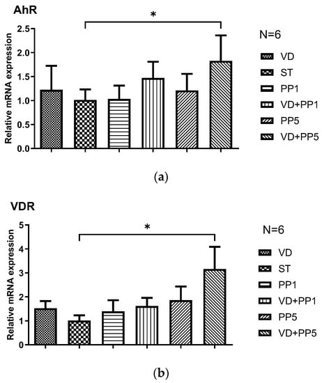 The synergistic effects of PP and VD3 on VDR and AhR mRNA expression in cecal mucosa of mice with Salmonella colitis. Mice were treated or infected as in Materials and Methods and divided into the following groups as above: Control, ST, VD, PP1 or PP5, VD + PP1, VD + PP5. Total RNA was extracted from the cecal tissues and quantitative RT-PCR was used to analyze the gene expression of AhR (a) and VDR (b) in the cecal tissue of infected and/or treated WT mice. Values are measured as fold increase compared to the level of control mice. The data shown are means ± SEM (n = 6 mice/group). * p < 0.05.