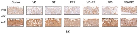 In order to determine if AhR or VDR protein is involved in the synergistic effects of the treatment combination in Salmonella colitis mice, the protein expression of AhR or VDR was analyzed using immunohistochemistry staining on the cecal tissue of Salmonella colitis mice in the absence or presence of PP or VD3.