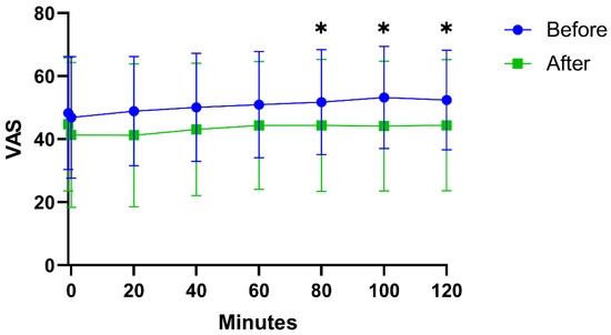 Pain intensity (VAS 0–100) during microdialysis in the vastus lateralis muscle in fibromyalgia patients before and after 15 weeks of resistance exercise intervention. There were significant (*) decrease in VAS at 80, 100, and 120 min after intervention.