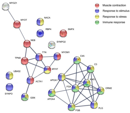 Pathway analysis of protein expression between fibromyalgia patients and healthy controls at baseline. The STRING version 11.0 was used to create the protein interaction analysis (https://string-db.org/ (accessed on 22 June 2022)). The proteins are coded with their protein accession number. The colored nodes represent biological processes. The non-colored nodes were not included in any of the processes marked on this network. For a complete list of biological processes, see Supplementary Table S2. ACTA1: Actin, alpha skeletal muscle; APOA1: Apolipoprotein A-I; APOA4: Apolipoprotein A-IV; C3: Complement C3; C4A: Complement C4-A; FGA: Fibrinogen alpha chain; FGB: Fibrinogen beta chain; GSN: Gelsolin; KNG1: Kininogen-1; MYH7: Myosin-7; MYOM1: Myomesin-1; MYOT: Myotilin; MYOZ1: Myozenin-1; NACA: Nascent polypeptide-associated complex subunit alpha, muscle-specific form; NEB: Nebulin; ORM2: Alpha-1-acid glycoprotein 2; PLG: Plasminogen; RBP4: Retinol-binding protein 4; SMPX: Small muscular protein; SYNPO: Synaptopodin; SYNPO2: Synaptopodin-2; TPM2: Tropomyosin beta chain; TTN: Titin; UBA52: Ubiquitin-60S ribosomal protein L40.