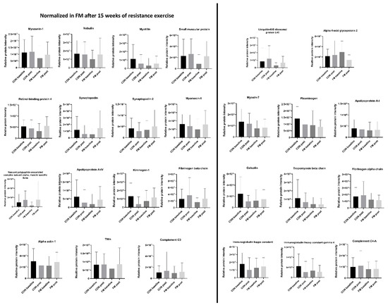 The protein expression level for FM was considered normalized if it reached the same level as the level in CON. Out of the 26 proteins, 15 proteins were normalized in FM. These proteins were myozenin-1, nebulin, myotilin, small muscular protein, retinol-binding protein 4, synaptopodin, synaptopodin-2, myomesin-1, nascent polypeptide-associated complex subunit alpha, apolipoprotein A-IV, kininogen-1, fibrinogen beta chain, Alpha-actin-1, titin, and complement C3.